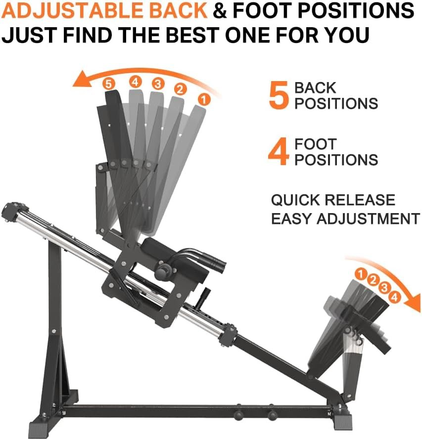 • 🔝【ADJUSTABLE DESIGN】: This hack squat machine is designed to fit any size users. 5-position adjustable limiter on the main tube and 2-position adjustable handles. You are free to choose your start and end positions. 5-angle adjustable for the backrest and 4-angle adjustable for the footboard, which ensures you can get a most comfortable position for yourself.